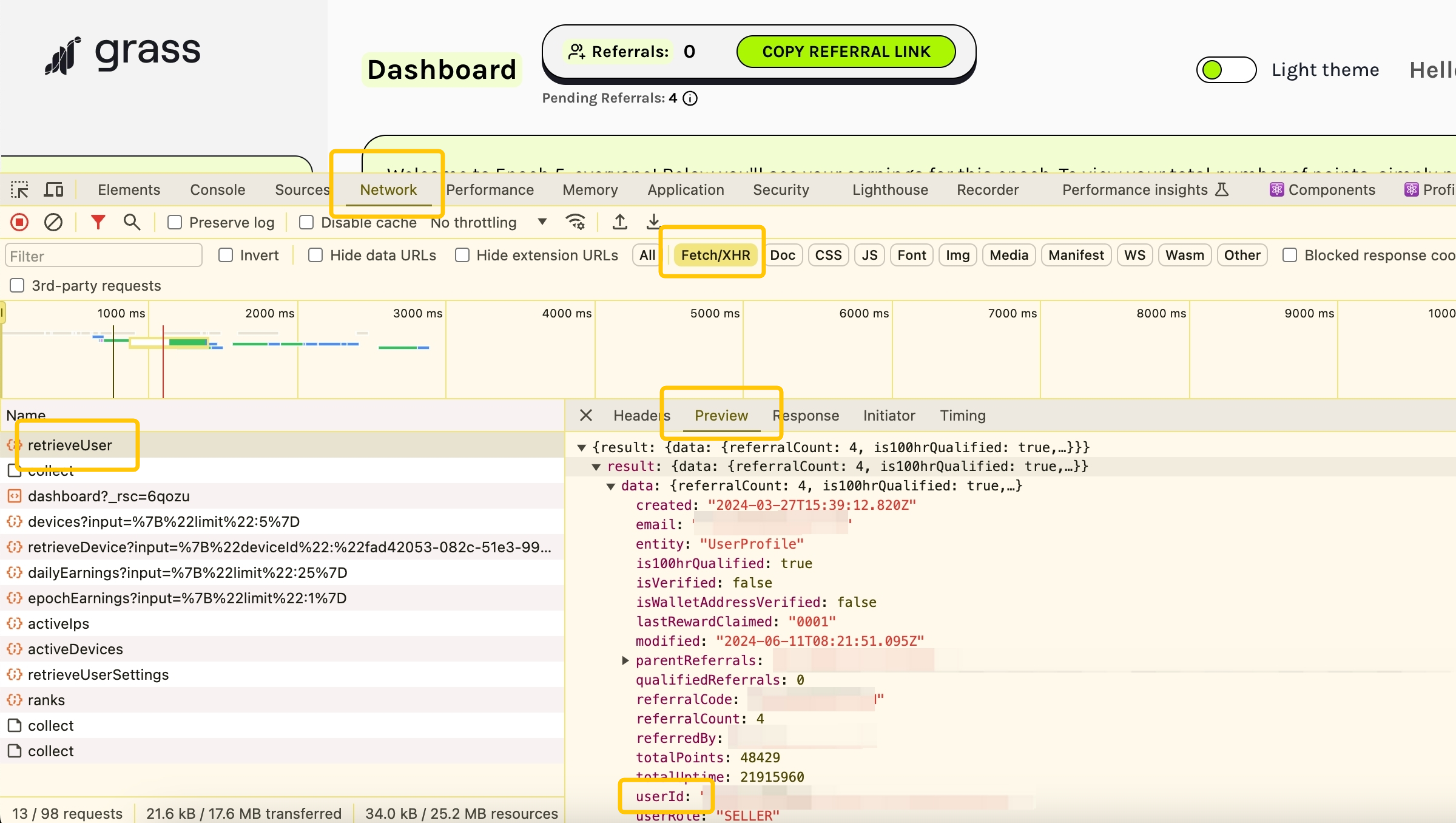 After refreshed the webpage, click "Network", "Fetch/XHR", "retrieveUser", and "Preview" in the boxes to enter the interface shown below.