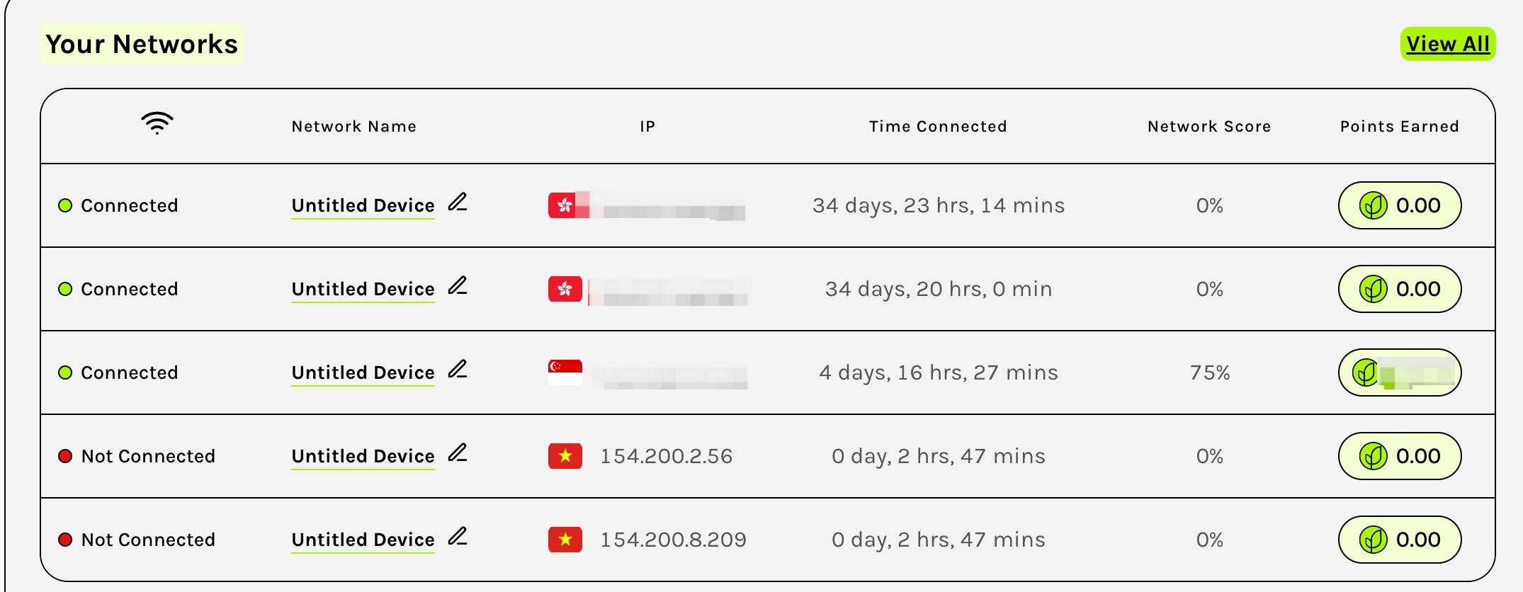 After the configuration is completed, you can see that the new device has been successfully added in "Your Networks" at the bottom of the Grass Dashboard, and it will show "Connected". You can confirm that the online time of the new device is consistent with the deployment time at "Time Connected".