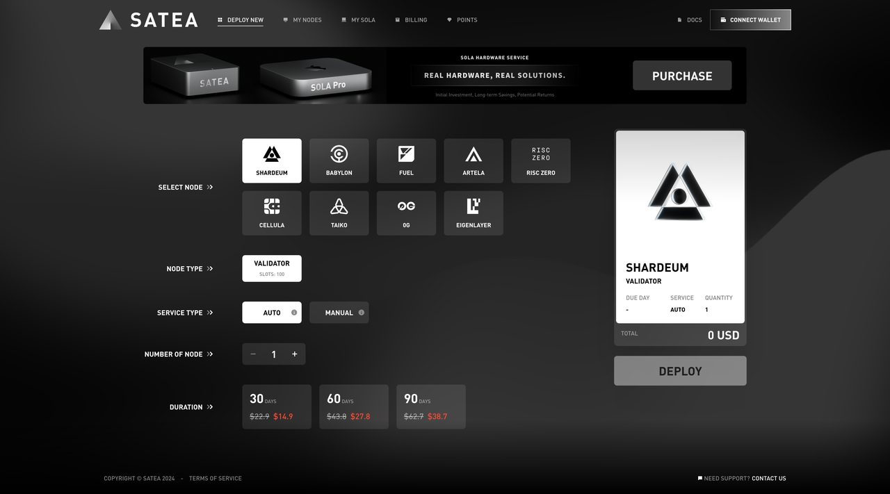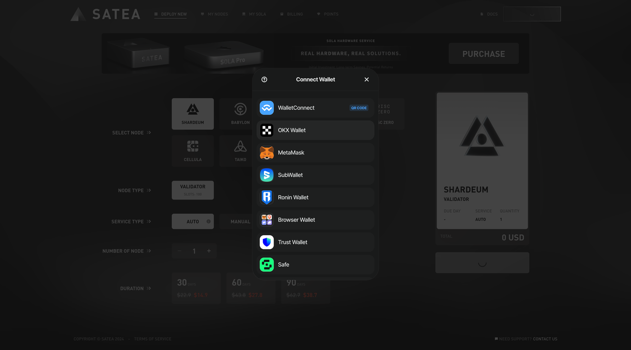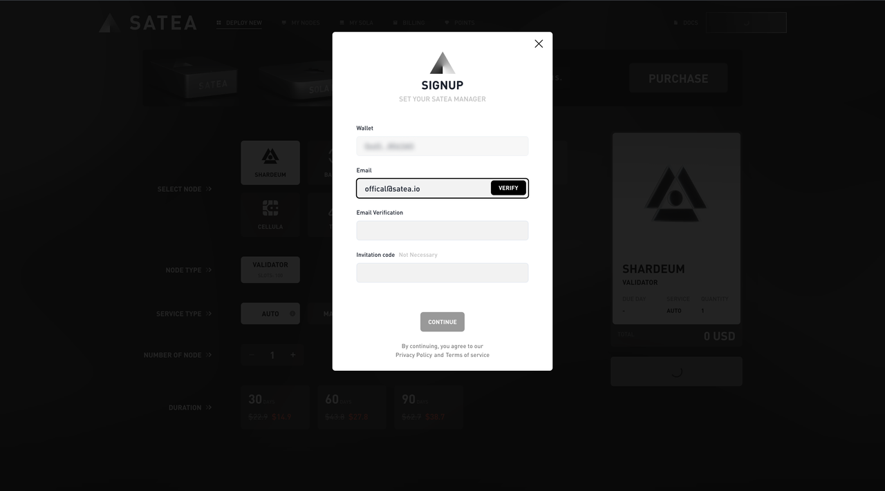 Fill in your email address, verify your email address, enter the verification code and select Continue. Now your Satea account is complete and you can order the nodes or hardware you want to run! Log in to your account and click on the wallet link in the upper right corner.